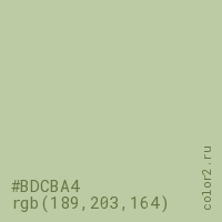 Цвет #BDCBA4 в цветовой модели RGB обозначается тремя октетами (189, 203, 164) в десятичном формате и #BDCBA4 в шестнадцатиричном (hex) формате, которые являются интенсивностью красного 189 (hex BD), интенсивность зелёного 203 (hex CB) и интенсивность синего 164 (hex A4).