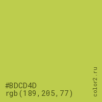 Цвет #BDCD4D в цветовой модели RGB обозначается тремя октетами (189, 205, 77) в десятичном формате и #BDCD4D в шестнадцатиричном (hex) формате, которые являются интенсивностью красного 189 (hex BD), интенсивность зелёного 205 (hex CD) и интенсивность синего 77 (hex 4D).