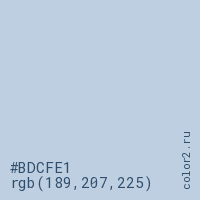 Цвет #BDCFE1 в цветовой модели RGB обозначается тремя октетами (189, 207, 225) в десятичном формате и #BDCFE1 в шестнадцатиричном (hex) формате, которые являются интенсивностью красного 189 (hex BD), интенсивность зелёного 207 (hex CF) и интенсивность синего 225 (hex E1).