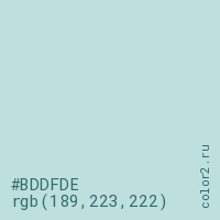 Цвет #BDDFDE в цветовой модели RGB обозначается тремя октетами (189, 223, 222) в десятичном формате и #BDDFDE в шестнадцатиричном (hex) формате, которые являются интенсивностью красного 189 (hex BD), интенсивность зелёного 223 (hex DF) и интенсивность синего 222 (hex DE).