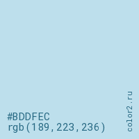 Цвет #BDDFEC в цветовой модели RGB обозначается тремя октетами (189, 223, 236) в десятичном формате и #BDDFEC в шестнадцатиричном (hex) формате, которые являются интенсивностью красного 189 (hex BD), интенсивность зелёного 223 (hex DF) и интенсивность синего 236 (hex EC).
