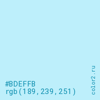 Цвет #BDEFFB в цветовой модели RGB обозначается тремя октетами (189, 239, 251) в десятичном формате и #BDEFFB в шестнадцатиричном (hex) формате, которые являются интенсивностью красного 189 (hex BD), интенсивность зелёного 239 (hex EF) и интенсивность синего 251 (hex FB).