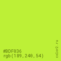 Цвет #BDF036 в цветовой модели RGB обозначается тремя октетами (189, 240, 54) в десятичном формате и #BDF036 в шестнадцатиричном (hex) формате, которые являются интенсивностью красного 189 (hex BD), интенсивность зелёного 240 (hex F0) и интенсивность синего 54 (hex 36).