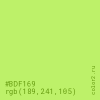 Цвет #BDF169 в цветовой модели RGB обозначается тремя октетами (189, 241, 105) в десятичном формате и #BDF169 в шестнадцатиричном (hex) формате, которые являются интенсивностью красного 189 (hex BD), интенсивность зелёного 241 (hex F1) и интенсивность синего 105 (hex 69).