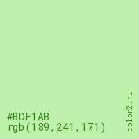 Цвет #BDF1AB в цветовой модели RGB обозначается тремя октетами (189, 241, 171) в десятичном формате и #BDF1AB в шестнадцатиричном (hex) формате, которые являются интенсивностью красного 189 (hex BD), интенсивность зелёного 241 (hex F1) и интенсивность синего 171 (hex AB).
