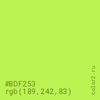 Цвет #BDF253 в цветовой модели RGB обозначается тремя октетами (189, 242, 83) в десятичном формате и #BDF253 в шестнадцатиричном (hex) формате, которые являются интенсивностью красного 189 (hex BD), интенсивность зелёного 242 (hex F2) и интенсивность синего 83 (hex 53).