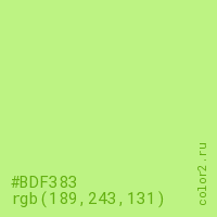 Цвет #BDF383 в цветовой модели RGB обозначается тремя октетами (189, 243, 131) в десятичном формате и #BDF383 в шестнадцатиричном (hex) формате, которые являются интенсивностью красного 189 (hex BD), интенсивность зелёного 243 (hex F3) и интенсивность синего 131 (hex 83).