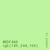 Цвет #BDF4A0 в цветовой модели RGB обозначается тремя октетами (189, 244, 160) в десятичном формате и #BDF4A0 в шестнадцатиричном (hex) формате, которые являются интенсивностью красного 189 (hex BD), интенсивность зелёного 244 (hex F4) и интенсивность синего 160 (hex A0).