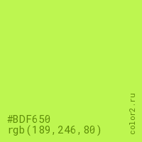 Цвет #BDF650 в цветовой модели RGB обозначается тремя октетами (189, 246, 80) в десятичном формате и #BDF650 в шестнадцатиричном (hex) формате, которые являются интенсивностью красного 189 (hex BD), интенсивность зелёного 246 (hex F6) и интенсивность синего 80 (hex 50).