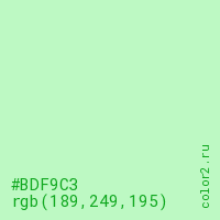 Цвет #BDF9C3 в цветовой модели RGB обозначается тремя октетами (189, 249, 195) в десятичном формате и #BDF9C3 в шестнадцатиричном (hex) формате, которые являются интенсивностью красного 189 (hex BD), интенсивность зелёного 249 (hex F9) и интенсивность синего 195 (hex C3).