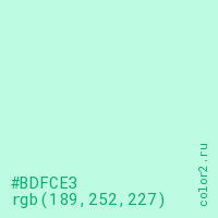 Цвет #BDFCE3 в цветовой модели RGB обозначается тремя октетами (189, 252, 227) в десятичном формате и #BDFCE3 в шестнадцатиричном (hex) формате, которые являются интенсивностью красного 189 (hex BD), интенсивность зелёного 252 (hex FC) и интенсивность синего 227 (hex E3).