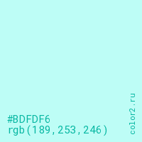 Цвет #BDFDF6 в цветовой модели RGB обозначается тремя октетами (189, 253, 246) в десятичном формате и #BDFDF6 в шестнадцатиричном (hex) формате, которые являются интенсивностью красного 189 (hex BD), интенсивность зелёного 253 (hex FD) и интенсивность синего 246 (hex F6).