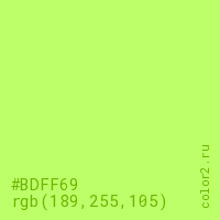 Цвет #BDFF69 в цветовой модели RGB обозначается тремя октетами (189, 255, 105) в десятичном формате и #BDFF69 в шестнадцатиричном (hex) формате, которые являются интенсивностью красного 189 (hex BD), интенсивность зелёного 255 (hex FF) и интенсивность синего 105 (hex 69).