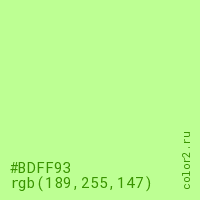 Цвет #BDFF93 в цветовой модели RGB обозначается тремя октетами (189, 255, 147) в десятичном формате и #BDFF93 в шестнадцатиричном (hex) формате, которые являются интенсивностью красного 189 (hex BD), интенсивность зелёного 255 (hex FF) и интенсивность синего 147 (hex 93).
