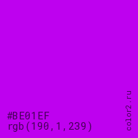 Цвет #BE01EF в цветовой модели RGB обозначается тремя октетами (190, 1, 239) в десятичном формате и #BE01EF в шестнадцатиричном (hex) формате, которые являются интенсивностью красного 190 (hex BE), интенсивность зелёного 1 (hex 01) и интенсивность синего 239 (hex EF).