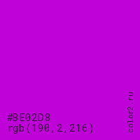 Цвет #BE02D8 в цветовой модели RGB обозначается тремя октетами (190, 2, 216) в десятичном формате и #BE02D8 в шестнадцатиричном (hex) формате, которые являются интенсивностью красного 190 (hex BE), интенсивность зелёного 2 (hex 02) и интенсивность синего 216 (hex D8).