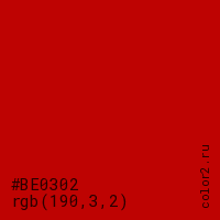 Цвет #BE0302 в цветовой модели RGB обозначается тремя октетами (190, 3, 2) в десятичном формате и #BE0302 в шестнадцатиричном (hex) формате, которые являются интенсивностью красного 190 (hex BE), интенсивность зелёного 3 (hex 03) и интенсивность синего 2 (hex 02).
