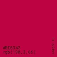 Цвет #BE0342 в цветовой модели RGB обозначается тремя октетами (190, 3, 66) в десятичном формате и #BE0342 в шестнадцатиричном (hex) формате, которые являются интенсивностью красного 190 (hex BE), интенсивность зелёного 3 (hex 03) и интенсивность синего 66 (hex 42).