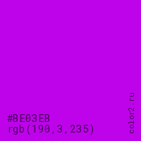 Цвет #BE03EB в цветовой модели RGB обозначается тремя октетами (190, 3, 235) в десятичном формате и #BE03EB в шестнадцатиричном (hex) формате, которые являются интенсивностью красного 190 (hex BE), интенсивность зелёного 3 (hex 03) и интенсивность синего 235 (hex EB).