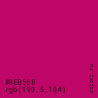 Цвет #BE0568 в цветовой модели RGB обозначается тремя октетами (190, 5, 104) в десятичном формате и #BE0568 в шестнадцатиричном (hex) формате, которые являются интенсивностью красного 190 (hex BE), интенсивность зелёного 5 (hex 05) и интенсивность синего 104 (hex 68).