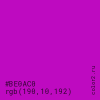 Цвет #BE0AC0 в цветовой модели RGB обозначается тремя октетами (190, 10, 192) в десятичном формате и #BE0AC0 в шестнадцатиричном (hex) формате, которые являются интенсивностью красного 190 (hex BE), интенсивность зелёного 10 (hex 0A) и интенсивность синего 192 (hex C0).