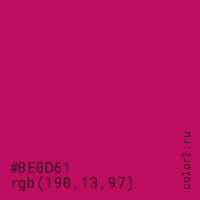 Цвет #BE0D61 в цветовой модели RGB обозначается тремя октетами (190, 13, 97) в десятичном формате и #BE0D61 в шестнадцатиричном (hex) формате, которые являются интенсивностью красного 190 (hex BE), интенсивность зелёного 13 (hex 0D) и интенсивность синего 97 (hex 61).
