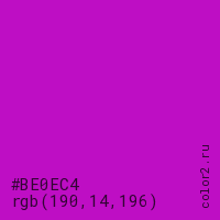 Цвет #BE0EC4 в цветовой модели RGB обозначается тремя октетами (190, 14, 196) в десятичном формате и #BE0EC4 в шестнадцатиричном (hex) формате, которые являются интенсивностью красного 190 (hex BE), интенсивность зелёного 14 (hex 0E) и интенсивность синего 196 (hex C4).
