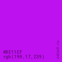 Цвет #BE11EF в цветовой модели RGB обозначается тремя октетами (190, 17, 239) в десятичном формате и #BE11EF в шестнадцатиричном (hex) формате, которые являются интенсивностью красного 190 (hex BE), интенсивность зелёного 17 (hex 11) и интенсивность синего 239 (hex EF).