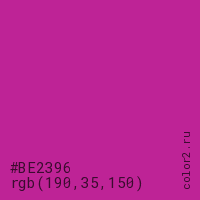 Цвет #BE2396 в цветовой модели RGB обозначается тремя октетами (190, 35, 150) в десятичном формате и #BE2396 в шестнадцатиричном (hex) формате, которые являются интенсивностью красного 190 (hex BE), интенсивность зелёного 35 (hex 23) и интенсивность синего 150 (hex 96).