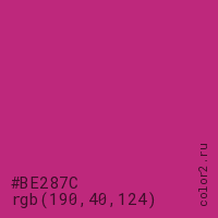 Цвет #BE287C в цветовой модели RGB обозначается тремя октетами (190, 40, 124) в десятичном формате и #BE287C в шестнадцатиричном (hex) формате, которые являются интенсивностью красного 190 (hex BE), интенсивность зелёного 40 (hex 28) и интенсивность синего 124 (hex 7C).