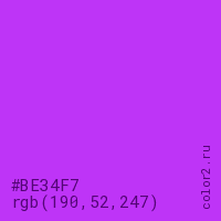 Цвет #BE34F7 в цветовой модели RGB обозначается тремя октетами (190, 52, 247) в десятичном формате и #BE34F7 в шестнадцатиричном (hex) формате, которые являются интенсивностью красного 190 (hex BE), интенсивность зелёного 52 (hex 34) и интенсивность синего 247 (hex F7).