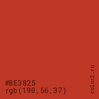 Цвет #BE3825 в цветовой модели RGB обозначается тремя октетами (190, 56, 37) в десятичном формате и #BE3825 в шестнадцатиричном (hex) формате, которые являются интенсивностью красного 190 (hex BE), интенсивность зелёного 56 (hex 38) и интенсивность синего 37 (hex 25).