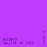 Цвет #BE3BFD в цветовой модели RGB обозначается тремя октетами (190, 59, 253) в десятичном формате и #BE3BFD в шестнадцатиричном (hex) формате, которые являются интенсивностью красного 190 (hex BE), интенсивность зелёного 59 (hex 3B) и интенсивность синего 253 (hex FD).