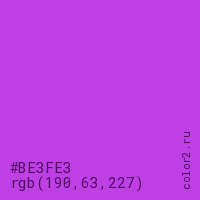 Цвет #BE3FE3 в цветовой модели RGB обозначается тремя октетами (190, 63, 227) в десятичном формате и #BE3FE3 в шестнадцатиричном (hex) формате, которые являются интенсивностью красного 190 (hex BE), интенсивность зелёного 63 (hex 3F) и интенсивность синего 227 (hex E3).