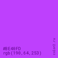 Цвет #BE40FD в цветовой модели RGB обозначается тремя октетами (190, 64, 253) в десятичном формате и #BE40FD в шестнадцатиричном (hex) формате, которые являются интенсивностью красного 190 (hex BE), интенсивность зелёного 64 (hex 40) и интенсивность синего 253 (hex FD).