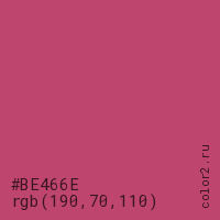 Цвет #BE466E в цветовой модели RGB обозначается тремя октетами (190, 70, 110) в десятичном формате и #BE466E в шестнадцатиричном (hex) формате, которые являются интенсивностью красного 190 (hex BE), интенсивность зелёного 70 (hex 46) и интенсивность синего 110 (hex 6E).
