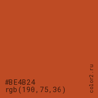 Цвет #BE4B24 в цветовой модели RGB обозначается тремя октетами (190, 75, 36) в десятичном формате и #BE4B24 в шестнадцатиричном (hex) формате, которые являются интенсивностью красного 190 (hex BE), интенсивность зелёного 75 (hex 4B) и интенсивность синего 36 (hex 24).