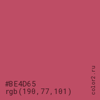 Цвет #BE4D65 в цветовой модели RGB обозначается тремя октетами (190, 77, 101) в десятичном формате и #BE4D65 в шестнадцатиричном (hex) формате, которые являются интенсивностью красного 190 (hex BE), интенсивность зелёного 77 (hex 4D) и интенсивность синего 101 (hex 65).
