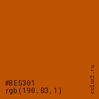 Цвет #BE5301 в цветовой модели RGB обозначается тремя октетами (190, 83, 1) в десятичном формате и #BE5301 в шестнадцатиричном (hex) формате, которые являются интенсивностью красного 190 (hex BE), интенсивность зелёного 83 (hex 53) и интенсивность синего 1 (hex 01).