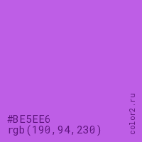 Цвет #BE5EE6 в цветовой модели RGB обозначается тремя октетами (190, 94, 230) в десятичном формате и #BE5EE6 в шестнадцатиричном (hex) формате, которые являются интенсивностью красного 190 (hex BE), интенсивность зелёного 94 (hex 5E) и интенсивность синего 230 (hex E6).