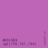 Цвет #BE65B8 в цветовой модели RGB обозначается тремя октетами (190, 101, 184) в десятичном формате и #BE65B8 в шестнадцатиричном (hex) формате, которые являются интенсивностью красного 190 (hex BE), интенсивность зелёного 101 (hex 65) и интенсивность синего 184 (hex B8).