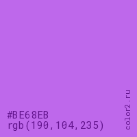 Цвет #BE68EB в цветовой модели RGB обозначается тремя октетами (190, 104, 235) в десятичном формате и #BE68EB в шестнадцатиричном (hex) формате, которые являются интенсивностью красного 190 (hex BE), интенсивность зелёного 104 (hex 68) и интенсивность синего 235 (hex EB).