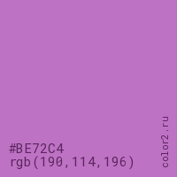 Цвет #BE72C4 в цветовой модели RGB обозначается тремя октетами (190, 114, 196) в десятичном формате и #BE72C4 в шестнадцатиричном (hex) формате, которые являются интенсивностью красного 190 (hex BE), интенсивность зелёного 114 (hex 72) и интенсивность синего 196 (hex C4).