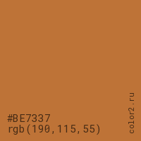 Цвет #BE7337 в цветовой модели RGB обозначается тремя октетами (190, 115, 55) в десятичном формате и #BE7337 в шестнадцатиричном (hex) формате, которые являются интенсивностью красного 190 (hex BE), интенсивность зелёного 115 (hex 73) и интенсивность синего 55 (hex 37).