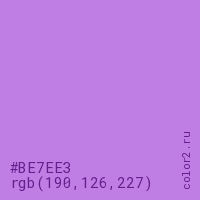 Цвет #BE7EE3 в цветовой модели RGB обозначается тремя октетами (190, 126, 227) в десятичном формате и #BE7EE3 в шестнадцатиричном (hex) формате, которые являются интенсивностью красного 190 (hex BE), интенсивность зелёного 126 (hex 7E) и интенсивность синего 227 (hex E3).