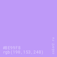 Цвет #BE99F8 в цветовой модели RGB обозначается тремя октетами (190, 153, 248) в десятичном формате и #BE99F8 в шестнадцатиричном (hex) формате, которые являются интенсивностью красного 190 (hex BE), интенсивность зелёного 153 (hex 99) и интенсивность синего 248 (hex F8).