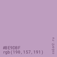 Цвет #BE9DBF в цветовой модели RGB обозначается тремя октетами (190, 157, 191) в десятичном формате и #BE9DBF в шестнадцатиричном (hex) формате, которые являются интенсивностью красного 190 (hex BE), интенсивность зелёного 157 (hex 9D) и интенсивность синего 191 (hex BF).