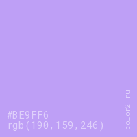 Цвет #BE9FF6 в цветовой модели RGB обозначается тремя октетами (190, 159, 246) в десятичном формате и #BE9FF6 в шестнадцатиричном (hex) формате, которые являются интенсивностью красного 190 (hex BE), интенсивность зелёного 159 (hex 9F) и интенсивность синего 246 (hex F6).