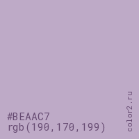 Цвет #BEAAC7 в цветовой модели RGB обозначается тремя октетами (190, 170, 199) в десятичном формате и #BEAAC7 в шестнадцатиричном (hex) формате, которые являются интенсивностью красного 190 (hex BE), интенсивность зелёного 170 (hex AA) и интенсивность синего 199 (hex C7).