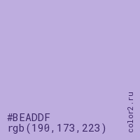 Цвет #BEADDF в цветовой модели RGB обозначается тремя октетами (190, 173, 223) в десятичном формате и #BEADDF в шестнадцатиричном (hex) формате, которые являются интенсивностью красного 190 (hex BE), интенсивность зелёного 173 (hex AD) и интенсивность синего 223 (hex DF).